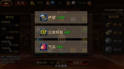 第四,是参加藏宝阁的掷骰子活动。主公在加入公会后,每日都可在公会藏宝阁参与掷骰子活动,每走入一个格子中都有机会获得体力、声望、钻石等奖励,每走完一层还可领取额外的通关奖励!此外每周所有公会成员都可领取一份海量的声望作为周奖励!