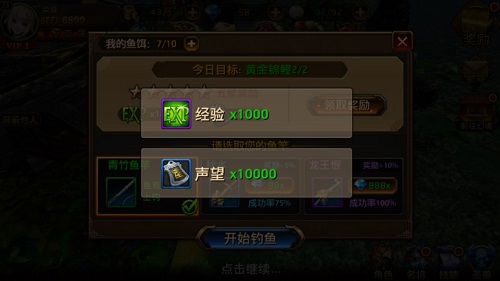 第二,是到主城广场中参加钓鱼活动。在钓鱼玩法中,每日都有不同的目标,比如一定数量的三色锦鲤、黄金锦鲤等等,达成目标即可获得经验与声望奖励!主公也可使用钻石来提升任务的星级,最高可提升至5星,完成任务后可获得1万的声望奖励!