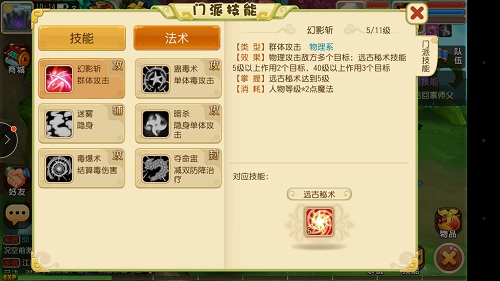 幻影斩:群攻;蛊毒术:单体,几率可附加中毒效果;迷雾:隐身;暗杀:隐身状态下使用,提高暴击和伤害;毒爆术:单体可引爆中毒;夺命盅:封印,提高敌方所受伤害且减治疗效果。
