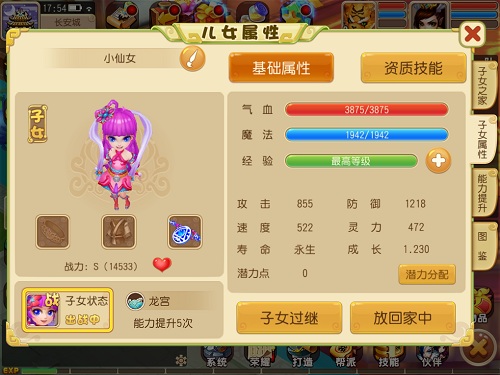 子女成年之后可以进行能力上的提升了,对于资质不太满意的成年子女可以使用洗髓丹可进行资质上的突破。子女升级可获得潜力点,不同发展方向的子女选择加点方式不同,即使对于加点有需要改动的时候也可以花费铜币进行洗点操作。装备上,子女可佩戴宠物装备和护符以及子女专属的饰品。
