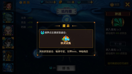 境界点获取途径:妖灵试炼系统、世界BOSS系统、神秘商店