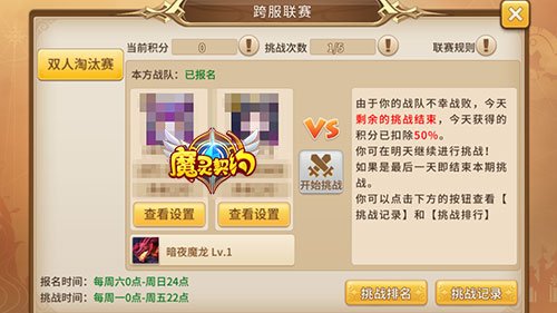 据悉,每周六0点-周日22点是《魔灵契约》跨服联赛的报名时间,达到60级以上的玩家可与好友组队前往报名,在这期间玩家可重组队伍或调整阵容重新报名;每周一0点-周五22点则是参赛时间,在这期间玩家每天可对5个对手进行挑战,挑战成功即可获得200积分,不过下一个对手的能力会大幅度提升;若挑战失败,则当天无法继续挑战,且扣除当天获得积分的50%……(更多详情请移步游戏内)