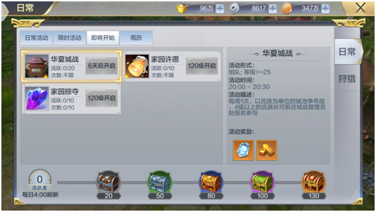 华夏城作为一个繁华的城市,向来都是兵家必争之地,黄帝蚩尤征战不断,黄帝重伤,华夏城无主谣言遍布九州。每周日8:00-8:30,华夏城战将会打响!氏族之间杀伐声四起,誓要争夺这块宝地!