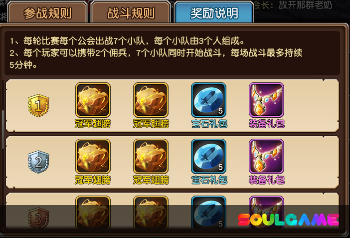 公会战带来的不仅是无上荣耀,更有好礼相送,凡是获得每周公会战资格的公会均有丰厚奖励!更值得一提的是如果能在公会战击败其他对手一举夺魁的话,将会得到属于冠军的至高荣誉——冠军翅膀。而亚军、四强、八强均可以获得专属礼包一份。用实力铸就辉煌,用汗水获得荣誉。